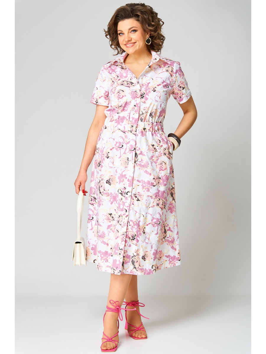 Платье полуприлегающего силуэта, расклешенное книзу. Воротник отложной, на притачной стойке. Платье отрезное по линии талии, на широкой резинке. Платье с центральной застежкой на петли и пуговицы на притачных планках. Полочка с нагрудными вытачками. В боковых швах юбки функциональные карманы. Рукав втачной короткий с широкой декоративной патой, понизу — притачная манжета.