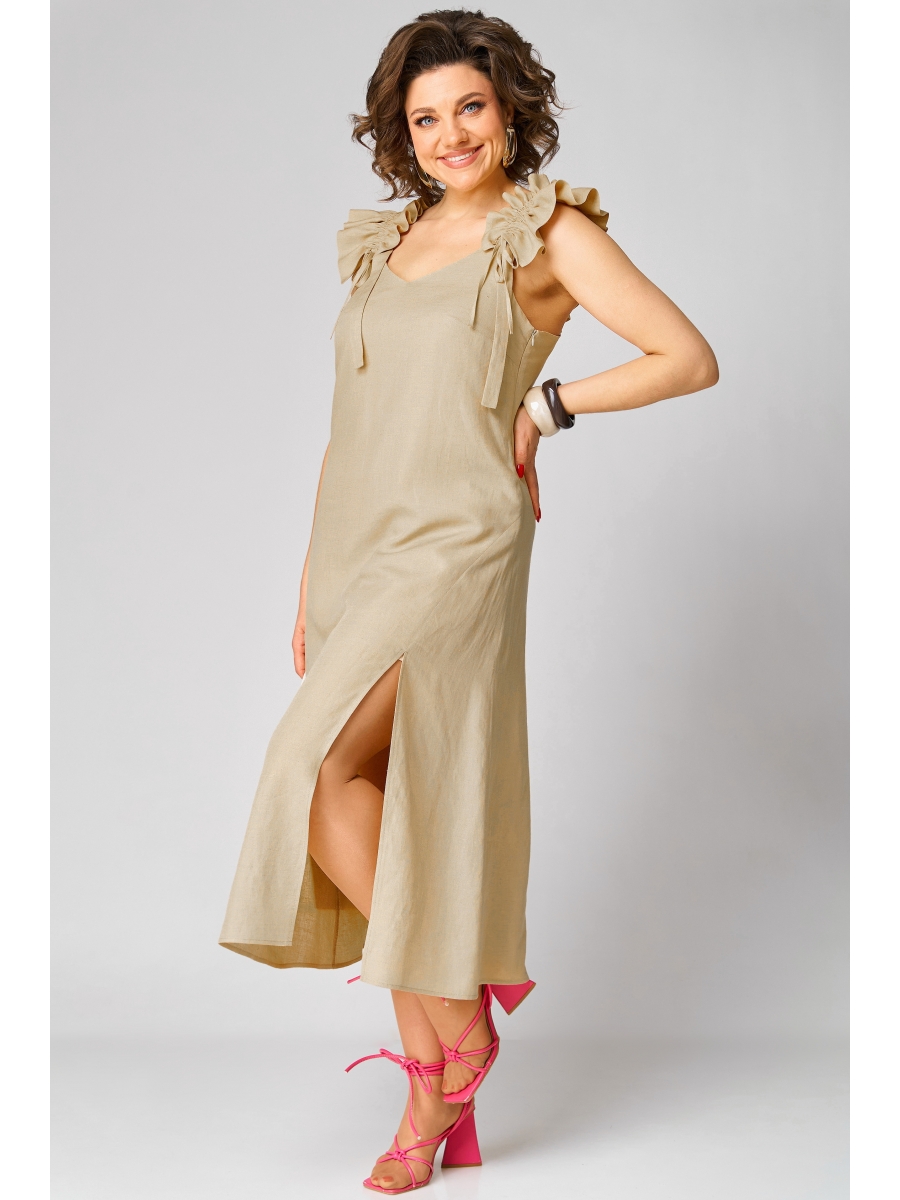 Платье полуприлегающее А-силуэта на тонких бретелях с застежкой. Горловина по переду V-образной формы. По переду нагрудные вытачки, а спинка - с рельефами. Застежка на потайную молнию в боковом шве.
