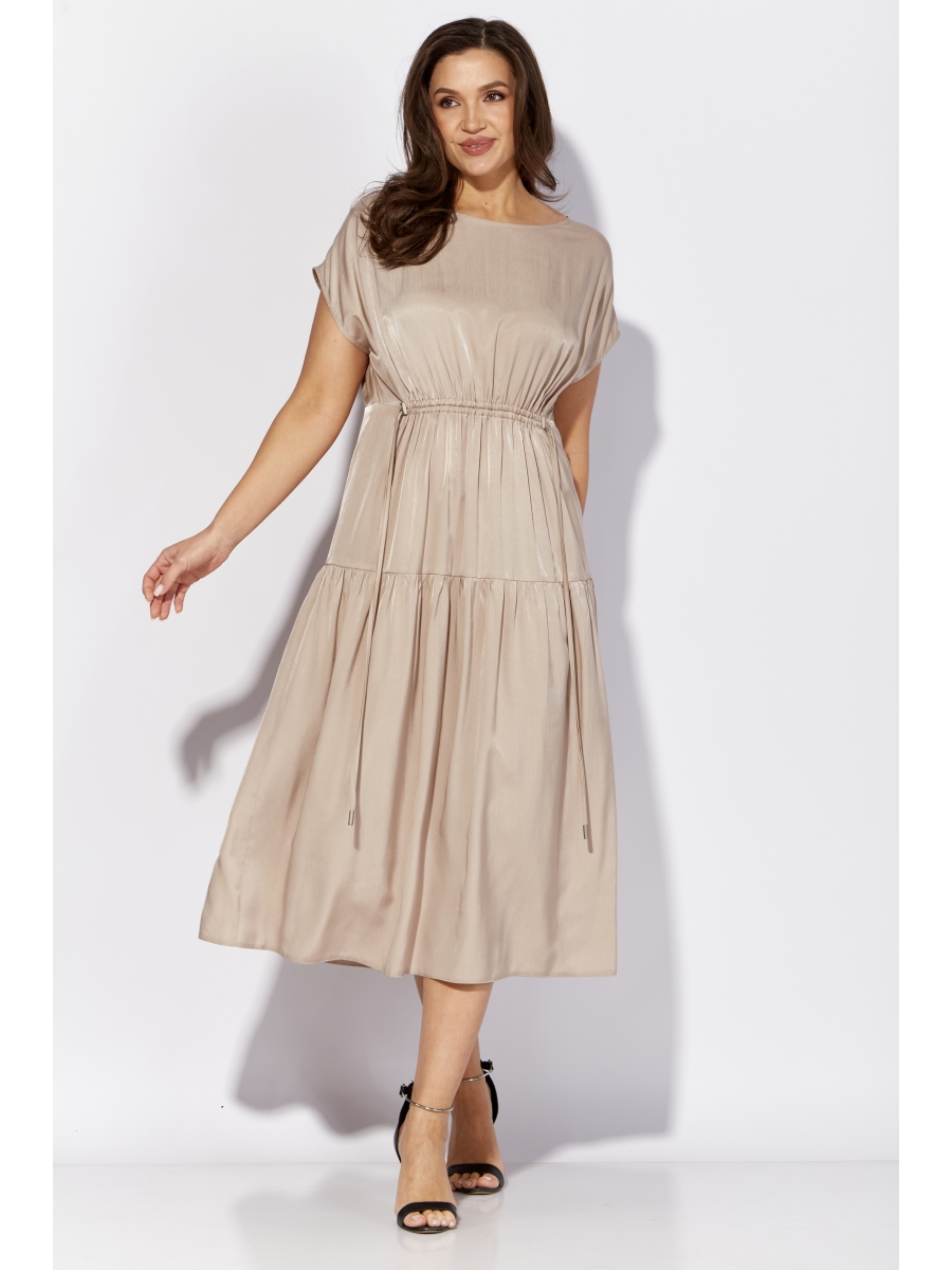 Оформить заказ →Платье женское, свободного силуэта, расширенное к низу. Рукав короткий, цельнокройный. Горловина круглой формы. По спинке небольшой разрез в средном шве, акцентирован декором "монетка". Разрез выше линии тали, по переду регулируется с фиксаторами. По центру спинки небольшая сборка. Подрез по линии бедер оформлен присобранным воланом.