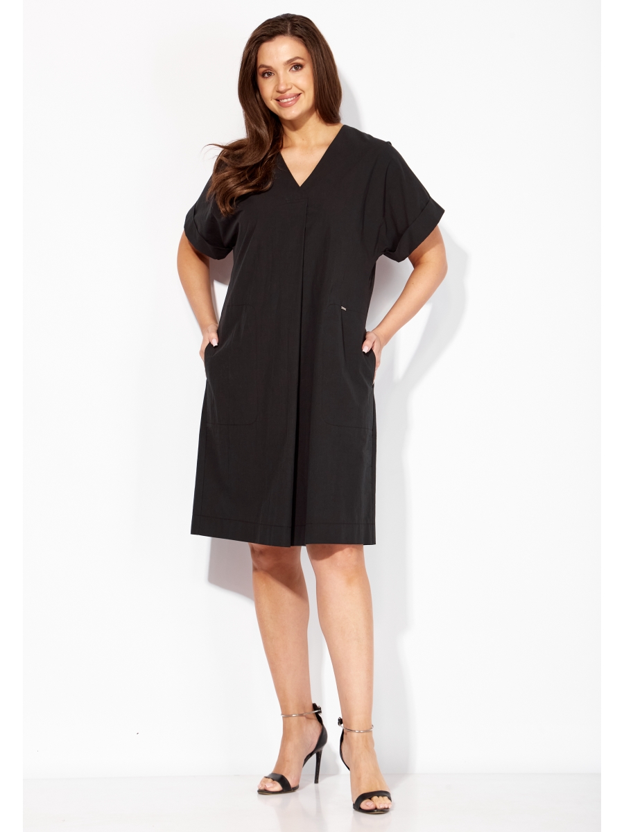 Оформить заказ →Платье женское, прямого силуэта с коротким цельнокроеным рукавом. По низу рукава манжета. Вырез горловины У-образной формы. По центру переда, от горловины мягкая складка. В боковых швах функциональные карманы с отделочной строчкой имитирующей накладной карман. По спинке отрезная кокетка, средний шов и мягкая, встречная складка по центру с отделочной нашивкой.