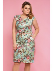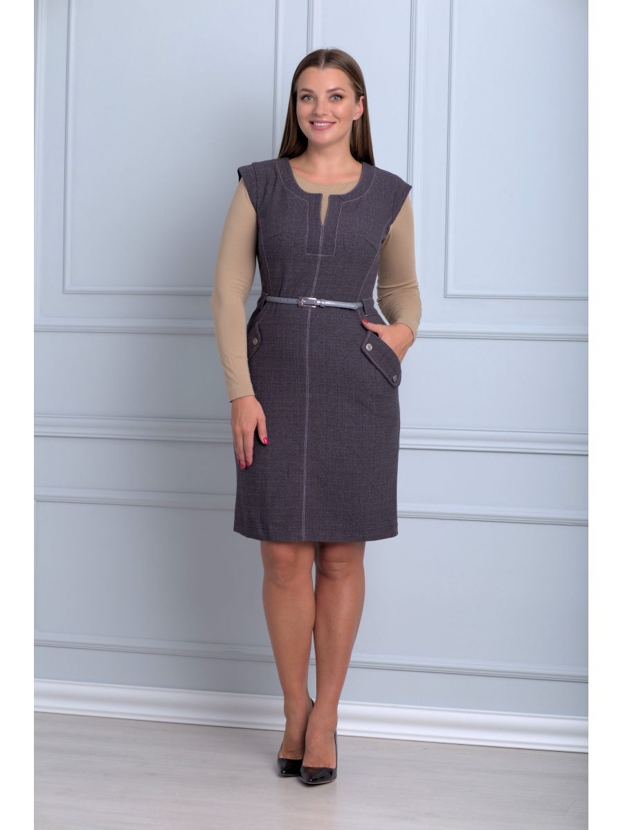 Платье прямого силуэта, по переду центральный шов, рельефы, переходящие в бочок, в рельефах рабочие карманы с притачным клапаном; вырез горловины круглый с разрезом, которые обработаны притачными деталями. Пройма с притачной фигурной деталью. Спинка со средним швом и талевыми вытачками. В области талии по боковым частям переда и спинки притачная кулиска для съемного ремня.