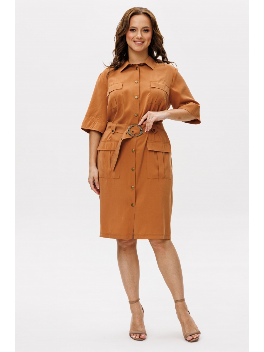 Четкий прямой силуэт платья подчеркивает женственность, сохраняя свободу движений. Втачной короткий рукав с аккуратной манжетой и рубашечный воротник на стойке придают образу собранность и завершенность. Практичность здесь сочетается с эстетикой – застежка на кнопках по всей длине позволяет легко регулировать степень открытости, а настрочные карманы с клапанами добавляют характерный штрих сафари-эстетики. Съемный пояс на пряжке дает возможность варьировать образ – от строгого делового до более непринужденного варианта.