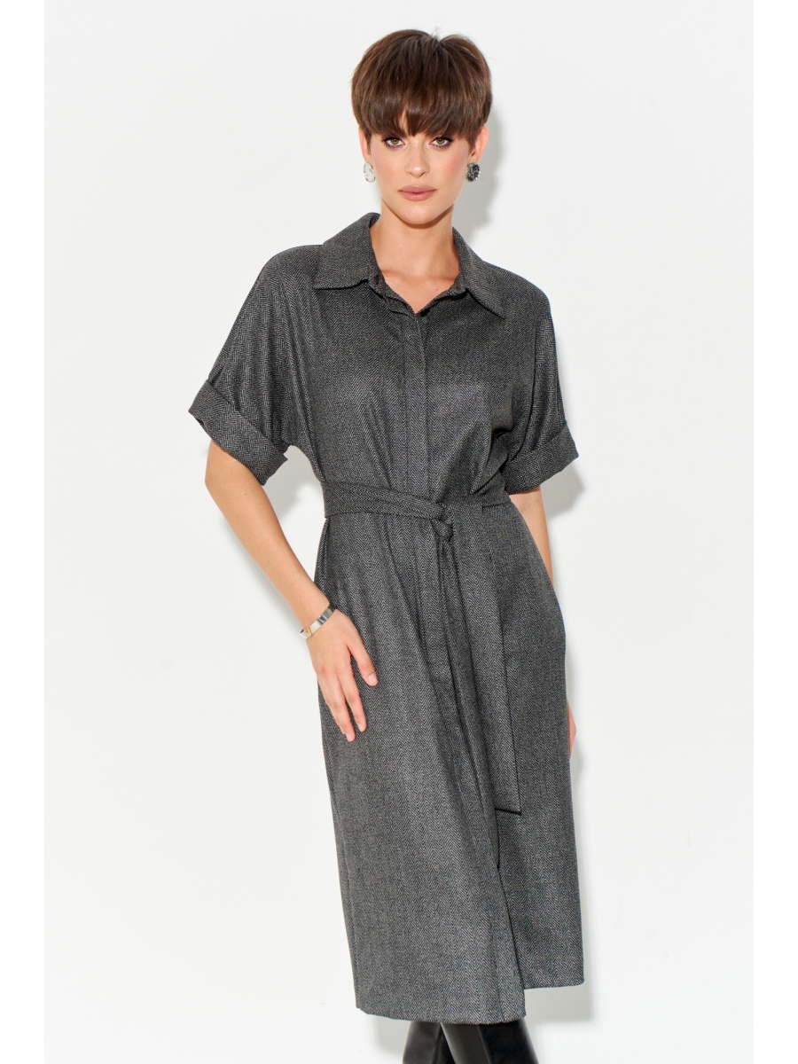 Базовое платье-рубашка полуприлегающего силуэта выпонено из натуральной плательной ткани. Воротник изделия пиджачного типа; рукава цельнокроенные; застёжка потайная на петли и пуговицы. В комплекте съёмный пояс из основной ткани.