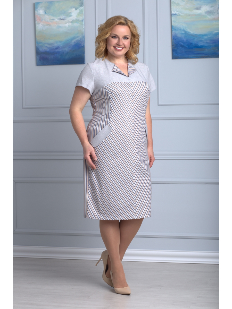 Платье прямого силуэта, по переду центральный шов, рельефы, переходящие в бочок, в рельефах рабочие карманы с притачным клапаном; вырез горловины круглый с разрезом, которые обработаны притачными деталями. Пройма с притачной фигурной деталью. Спинка со средним швом и талевыми вытачками. Модель с подчёркивающим фигуру кроем.