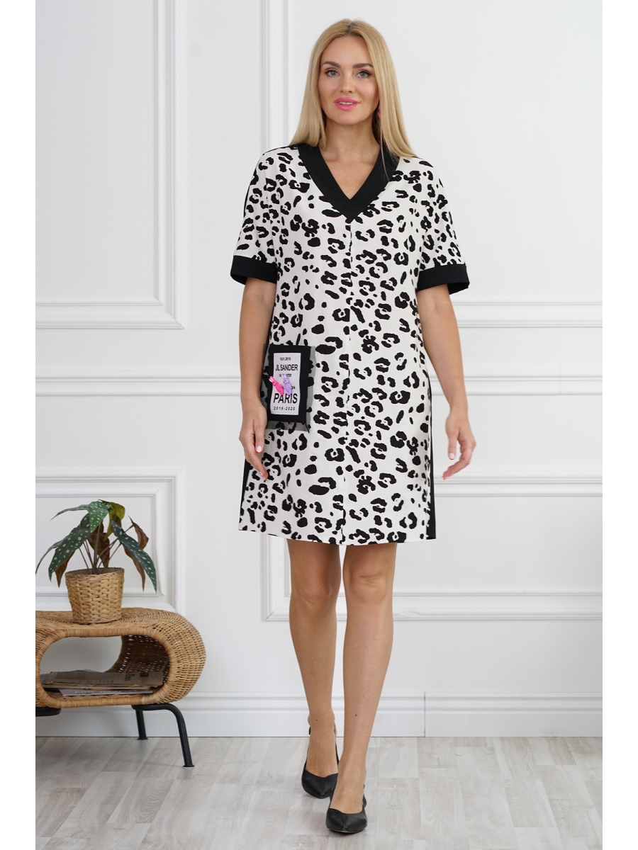 Оформить заказ →Платье женское прямого, свободного силуэта, с цельнокроеными короткими рукавами понизу с притачными манжетами. Вырез горловины V-образной формы с притачной планкой. Перед со средним швом и накладным боковым карманом по правой части декорированный по центру нашивкой и отделочной деталью по краям. Спинка со средним швом.