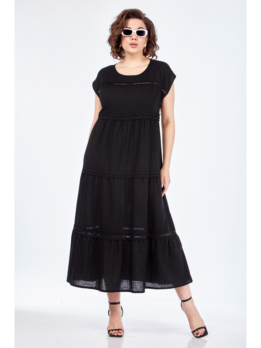 Платье женское А-силуэта из легкой плательной ткани. Линия плеча спущенная. Платье по спинке и переду разрезное. Горловина круглой формы. Декором служат вставки кружева.