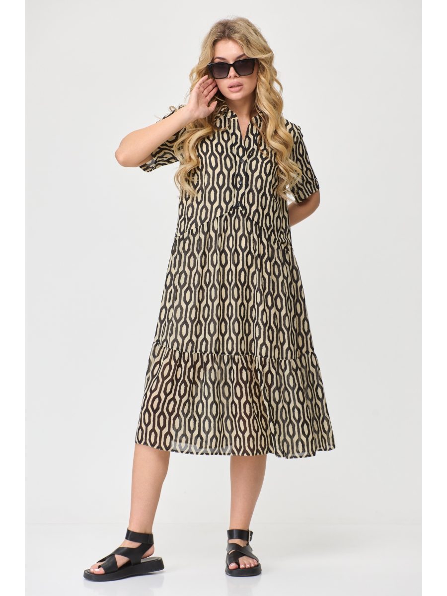 Актуальный в этом сезоне принт, свободный силуэт платья, подойдёт для любых типов фигуры! Рукав втачной,свободного кроя.Воротник - стояче отложной со стойкой.По переду платья в области груди застежка на три петли и пуговицы. Платье выполнено в виде ярусов, которые красиво развиваються при ходьбе.