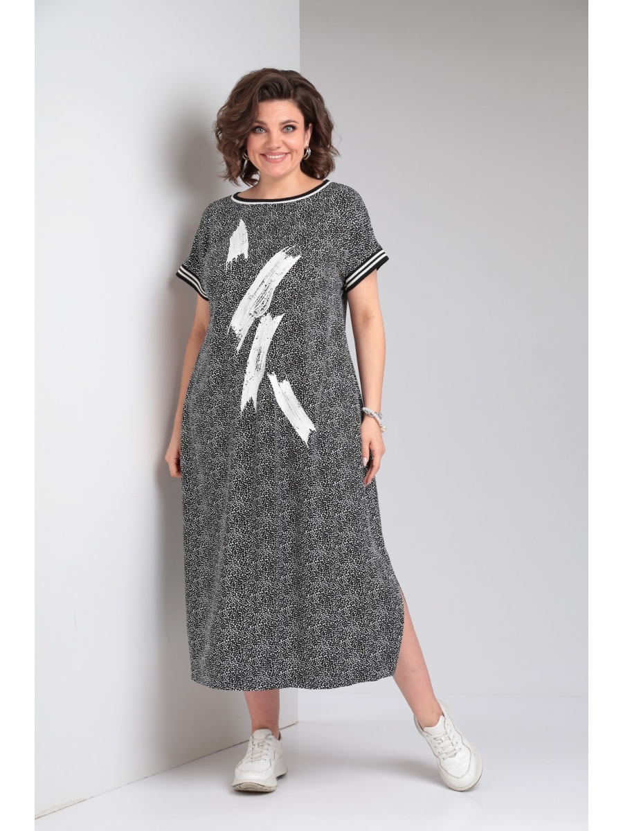 Оформить заказ →Платье женское свободного силуэта в стиле «боххо», вырез горловины округлый с декоративной трикотажной резинкой. Изделие без рукава со спущенной линией плеча и отделкой по низу. В боковых швах карманы и фигурные разрезы по низу. Декором является принт по полочке. По спинке – имитация планки с пуговицами. Платье без застежки.