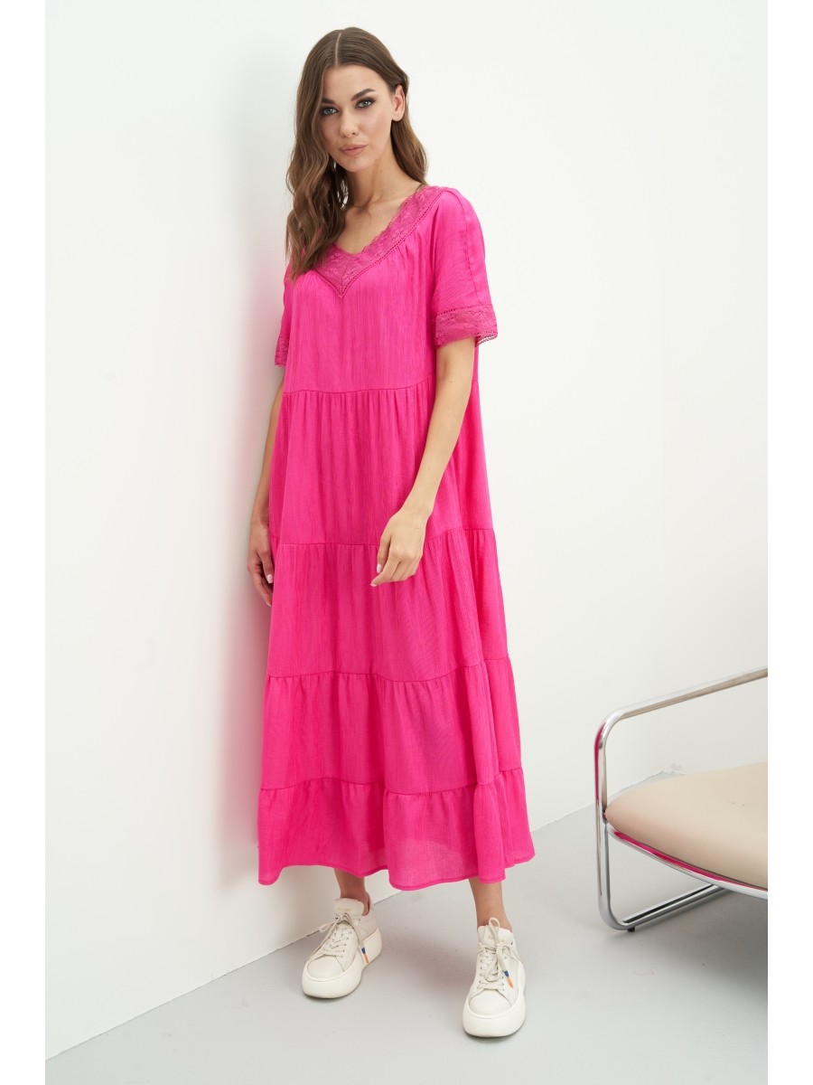 Платье с V-образным вырезом горловины, отрезное чуть выше линии талии, с коротким рукавом покроя-реглан имеет конструктивное решение в виде широких воланов с легкими сборками.