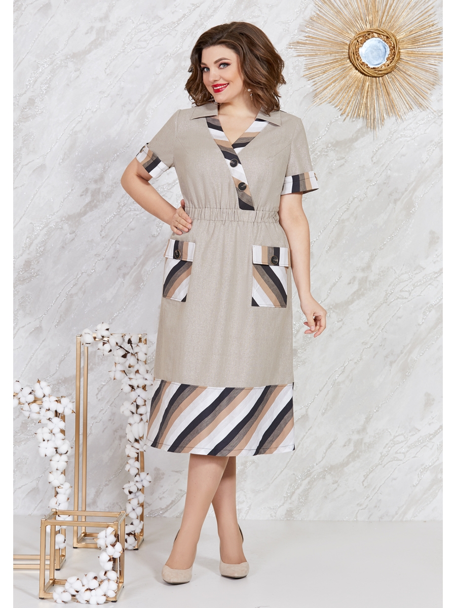 Оформить заказ →Летнее, женское платье, выполнено из льна с люрексом и ткани в полоску. Лиф по линии талии отрезной, с втачным поясом на резинке, присборен. Горловина платья V- образной формы, обработана притачной планкой из полоски и декорирована пуговицами, также по горловине втачной воротник из льна. Юбка платья расклешенного силуэта, по низу притачная деталь из полоски, также на полочке накладные карманы из полоски с пуговицами. Рукав втачной, оптимальной длины, по низу притачная манжета из полоски. Спинка отрезная по линии талии, с втачным поясом на резинке, на лифе отрезная кокетка из полоски. Летнее платье с яркой отделкой отличный выбор для лета!