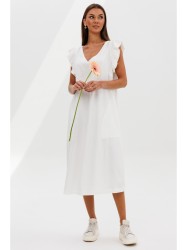 Свободный А-силуэт, изящный V-образный вырез, романтичное крылышко, комфортная длина миди. Полочка с нагрудной вытачкой и карманом в боковом шве. Спинка со средним швом, вырезом каре и эффектной завязкой, удерживающей линию горловины.