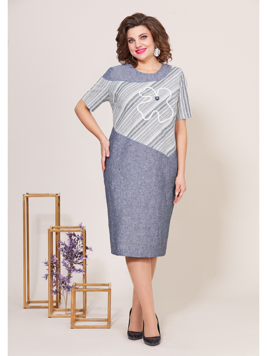 Летнее женское платье полу-прилегающего силуэта, выполнено из льняной ткани в полоску и однотонного льна. Горловина платья округлой формы, на обтачке, на переднем полотнище выполнена ассиметричная вставка из льна в полоску, с отделкой кантом. Также на переднем полотнище выполнены вытачки и декор из настрочного шнура с пуговицей. Рукав втачной, укороченный из льна в полоску. Спинка идентична полочке, также с вставкой из ткани в полоску, со средним швом и вытачками. Легкое платье прекрасный выбор для летнего гардероба!