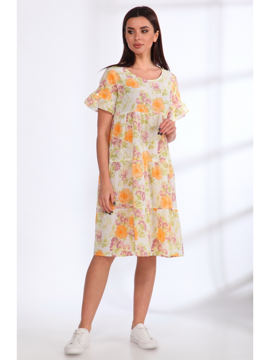 Оформить заказ →Стильное, нарядное платье в нем вы будете неотразимы. Платье свободного силуэта с цельнокроеным рукавом, к которому пришита небольшая рюша. Платье сосоит из трех объемных воланов.