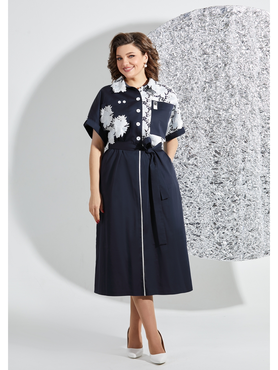 Стильное, женское платье полу-прилегающего силуэта, выполнено из легкой ткани (в составе вискоза) и кружева на хлопковой основе. Лиф платья отрезной по линии талии, по переду выполнена застежка на планку с пуговицами, горловина платья обработана воротником рубашечного типа из однотона, декорированного кружевом. Одна сторона полочки выполнена из кружева, наложенного на синий однотон, с накладным карманом из однотона, декорированным нашивкой. Вторая часть полочки выполнена из однотона, также с накладным карманом, декорированным аппликацией из кружева. Юбка платья расклешенная к низу, по переду с швом декорированным кантом, в боковых швах карманы. Спинка идентична переду, с отрезной кокеткой и средним швом, рукав цельнокроеный с полочкой и спинкой, по низу на манжете из однотона.