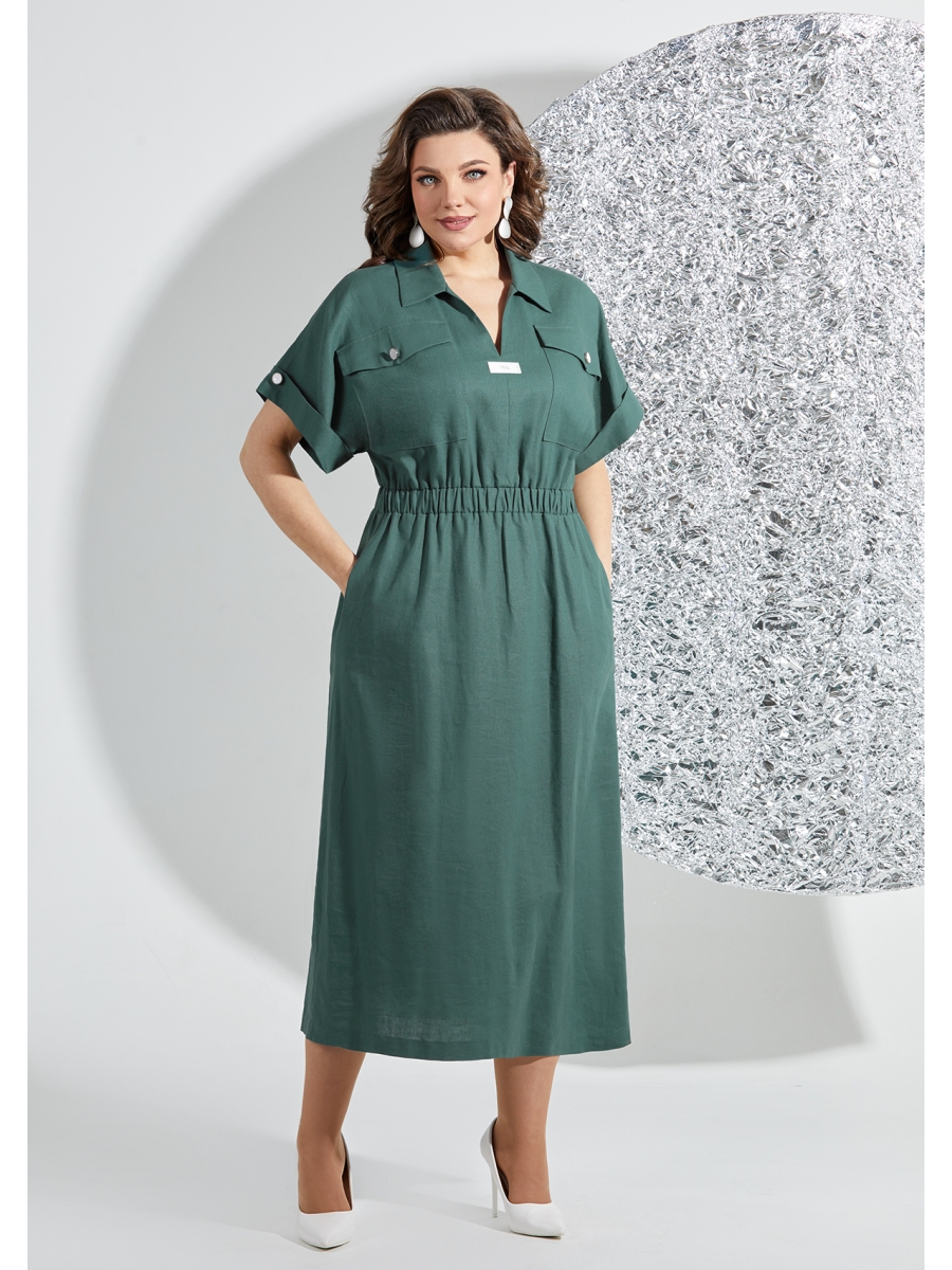 Летнее платье полу-прилегающего силуэта, выполнено из смесового льна (в составе лен и хлопок, ткань менее мнется). Лиф платья отрезной по линии талии, с втачным поясом на резинке, горловина V-образной формы, обработана втачным воротником. Рукав цельнокроеный, спущенный, по низу на манжете. Также на полочке обработаны накладные карманы с клапаном на пуговицу. Юбка платья расклешенная к низу, длиной midi, в боковых шах карманы. Спинка идентична полочке, отрезная по линии талии, на лифе обработаны вертикальные подрезы, также спинка декорирована терм-печатью.
