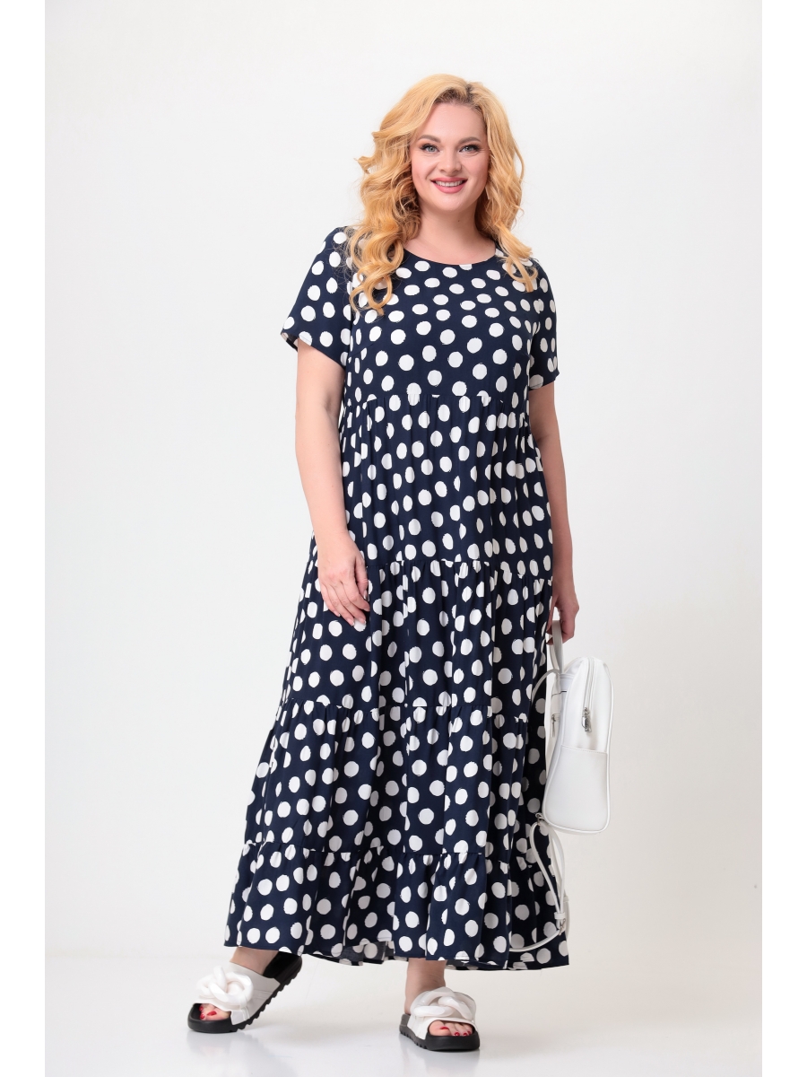 Платье полуприлегающего силуэта, длиной maxi. Выполнено из вискозной ткани. Платье с отрезной, слегка завышенной линией талии. По переду лифа расположены нагрудные вытачки. Рукав втачной короткий. Горловина округлой формы. По низу платья - 4 волана, собранные на сборку. В боковых швах платья расположены карманы.