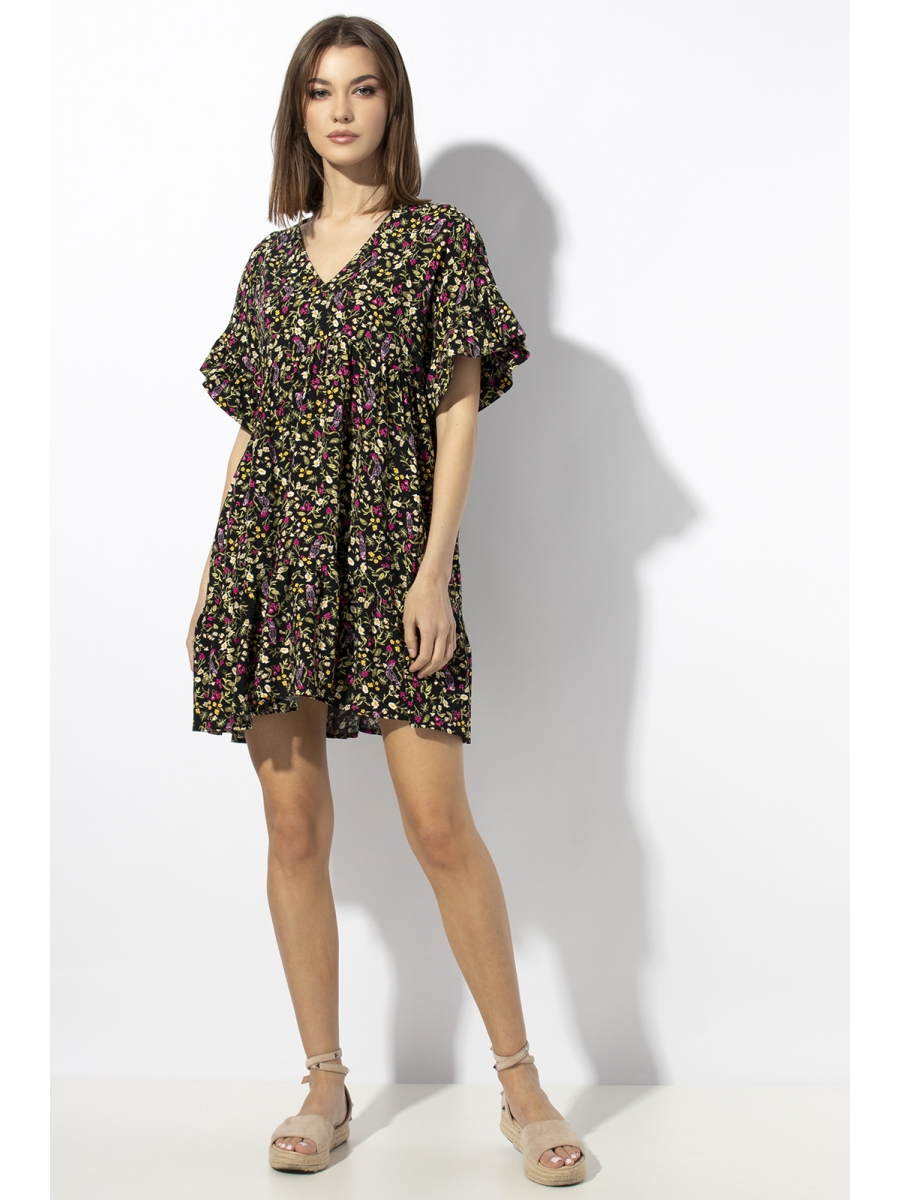 Платье женское повседневное из штапельного полотна, свободного силуэта. Горловина V-образной формы. Передняя и задняя часть двумя отрезами и мелкой сборкой по всему изделию. Плечо спущенное. Рукав цельнокроеный, короткий, с оборкой по низу.