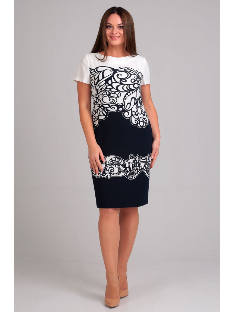 Оформить заказ →Платье женское прямое, приталенное по спинке. Изделие выполнено из купонной ткани, при этом рисунок по низу темный, а по плечам и горловине - светлый. Рукав короткий, прямой. Горловина в виде лодочки. Застежка на потайную молнию, по центру спинки. Нагрудные вытачки направлены по косой линии от талии вверх. Снизу, сзади выполнена шлица.