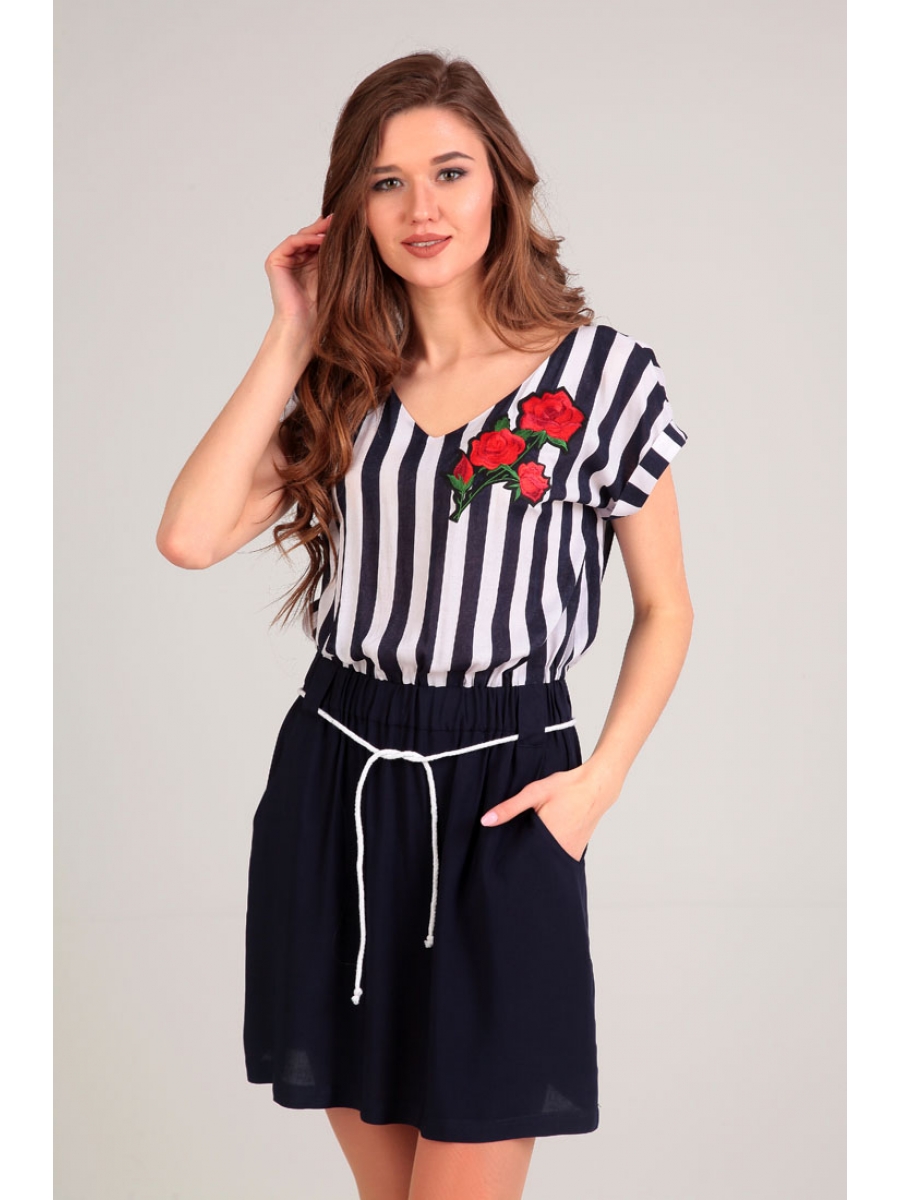 Оформить заказ →Платье-туника - свободного силуэта, отрезное по талии, пояс на резинке, с продетым через шлевки шнуром. Верхняя часть платья выполнена из полоски. Плечевой шов спущен, горловина углубленная , по спинке окантована, а по полочке на обтачке. На левой стороне полочки пришита аппликация. Манжеты притачные, с отворотом. На юбке платья обработаны боковые карманы.