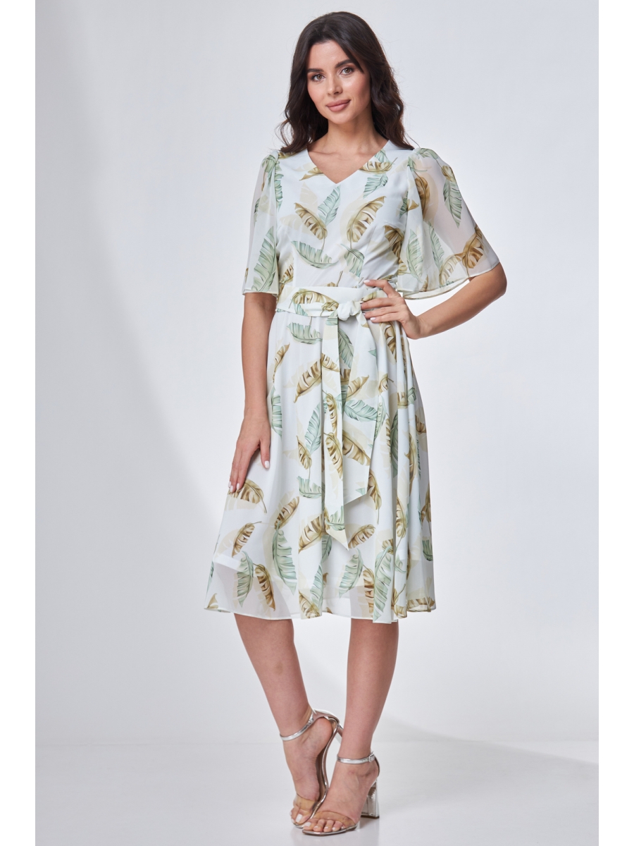 Платье полуприлегающего силуэта, расклешенное книзу, на трикотажной подкладке. Горловина V-образной формы. Платье отрезное по линии талии. По переду нагрудные и талиевые вытачки. Спинка с рельефами и потайной застежкой молнией в среднем шве. Рукав втачной расклешенный короткий, со сборкой по окату. В комплекте съемный пояс из основной ткани.