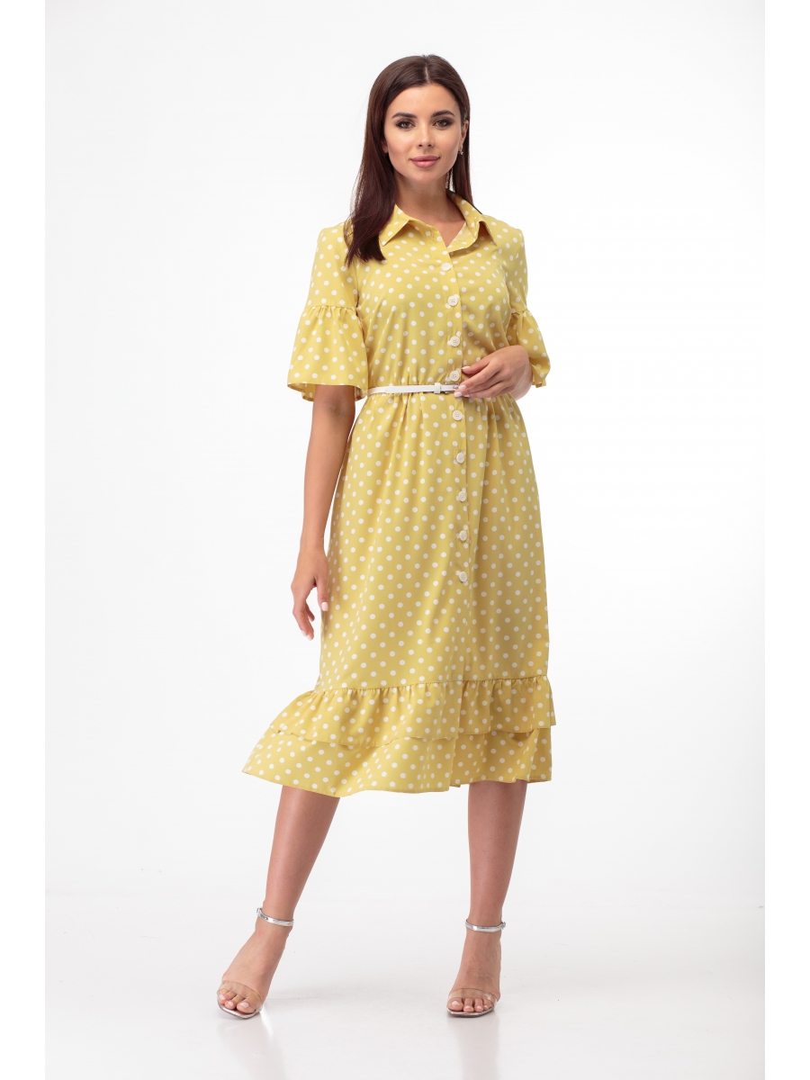 Полуприлегающий силуэт, отрезное по линии талии, нагрудные вытачки втачные рукава с воланом. Отложной воротник на стойке. Функциональная застежка по планке на пуговицы по всей длине. Воланы по низу платья.