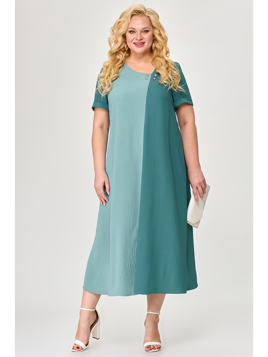 Идеальное платье свободного кроя в Ваш гардероб. С этим платьем в стиле "бохо" отлично будут смотреться как туфли на каблуке, так и удобная обувь на плоской подошве. Платье выполнено из качественного, не мнущегося и очень приятного к телу материала в сочетании двух цветов. Асимметричная горловина и разрез по рельефу полочки делают платье женственным и неповторимым. Рукав короткий, с манжетой. Спинка без среднего шва. Декором платья служат две стильные булавочки. Платье Вам подойдет как на каждый день, так и на праздничный выход.