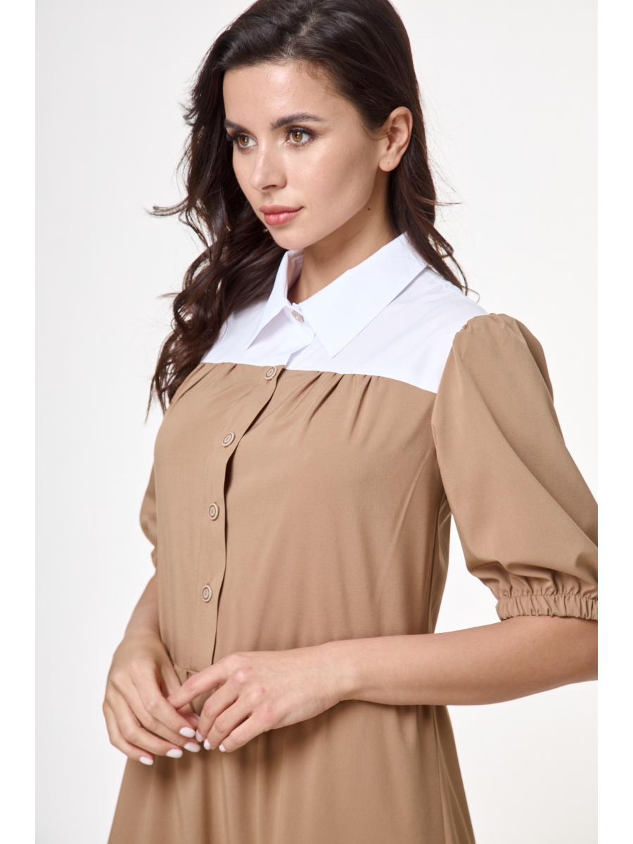 Платье рубашка, отрезное по талии, длиной миди. Рукав 3/4, на резинке. Классический рубашечный воротник. Застежка на петли пуговицы по переду до талии. Юбка резная со сборкой. Платье уникально своей расцветкой, будет притягивать восхищенные взгляды и придаст вашему образу женственности.