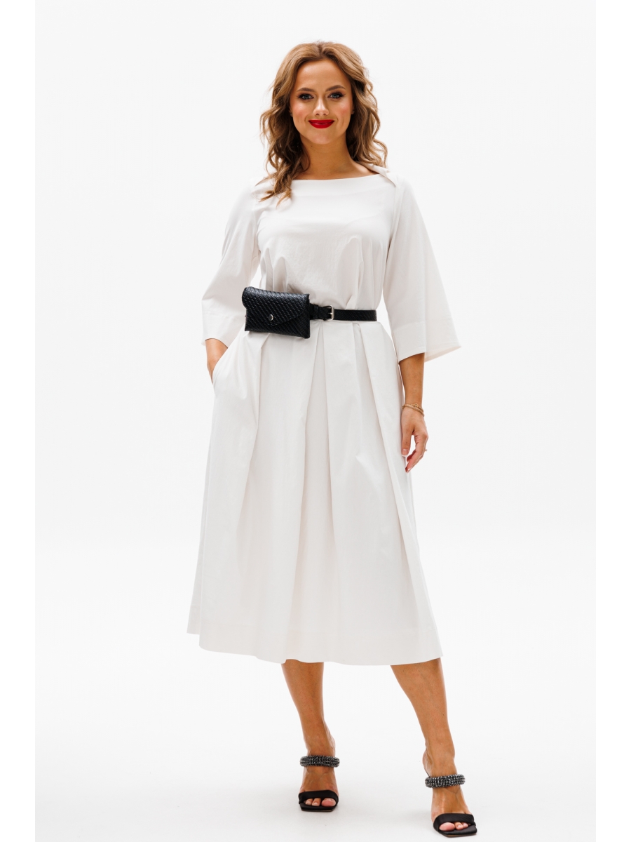 Элегантное женское платье из текстильной ткани. Отрезное по линии талии. По полочке объем груди создается за счет направленных складок из подреза. Объем юбки создается за счет центральной встречной и 2-х односторонних складок. По бокам в юбке-карманы. Юбка на подкладке. Рукав втачной, 3/4 длинны с отворотом. Вырез горловины лодочка с отложным воротником.