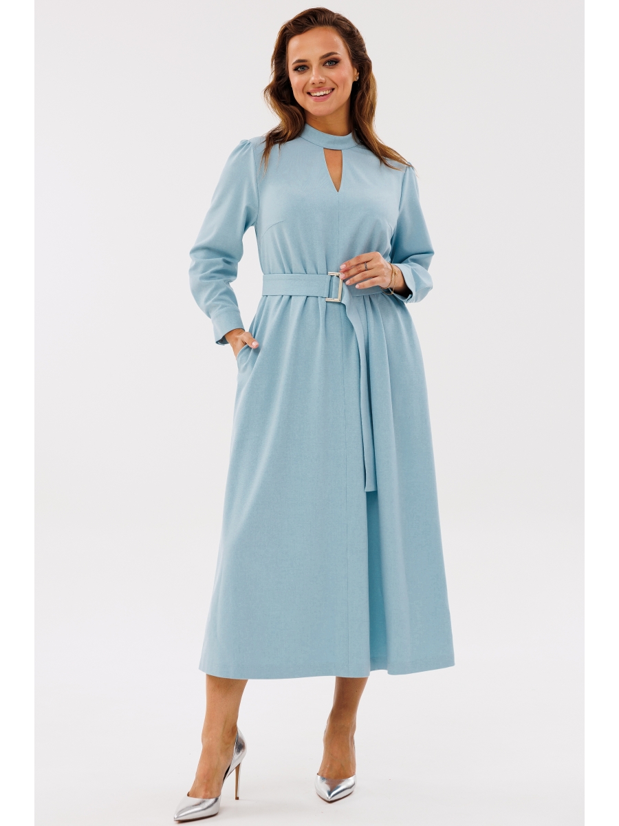 Платье А-силуэта длиной миди. Горловина на притачной стойке с V-образным вырезом, по спинке с застежкой на кнопки. Перед платья с нагрудными вытачками и средним швом. Спинка со средним швом. В боковых швах обработаны карманы. Рукав втачной длиной ⅞, со сборкой по окату, по низу рукава - манжет с застежкой на петлю и пуговицу.