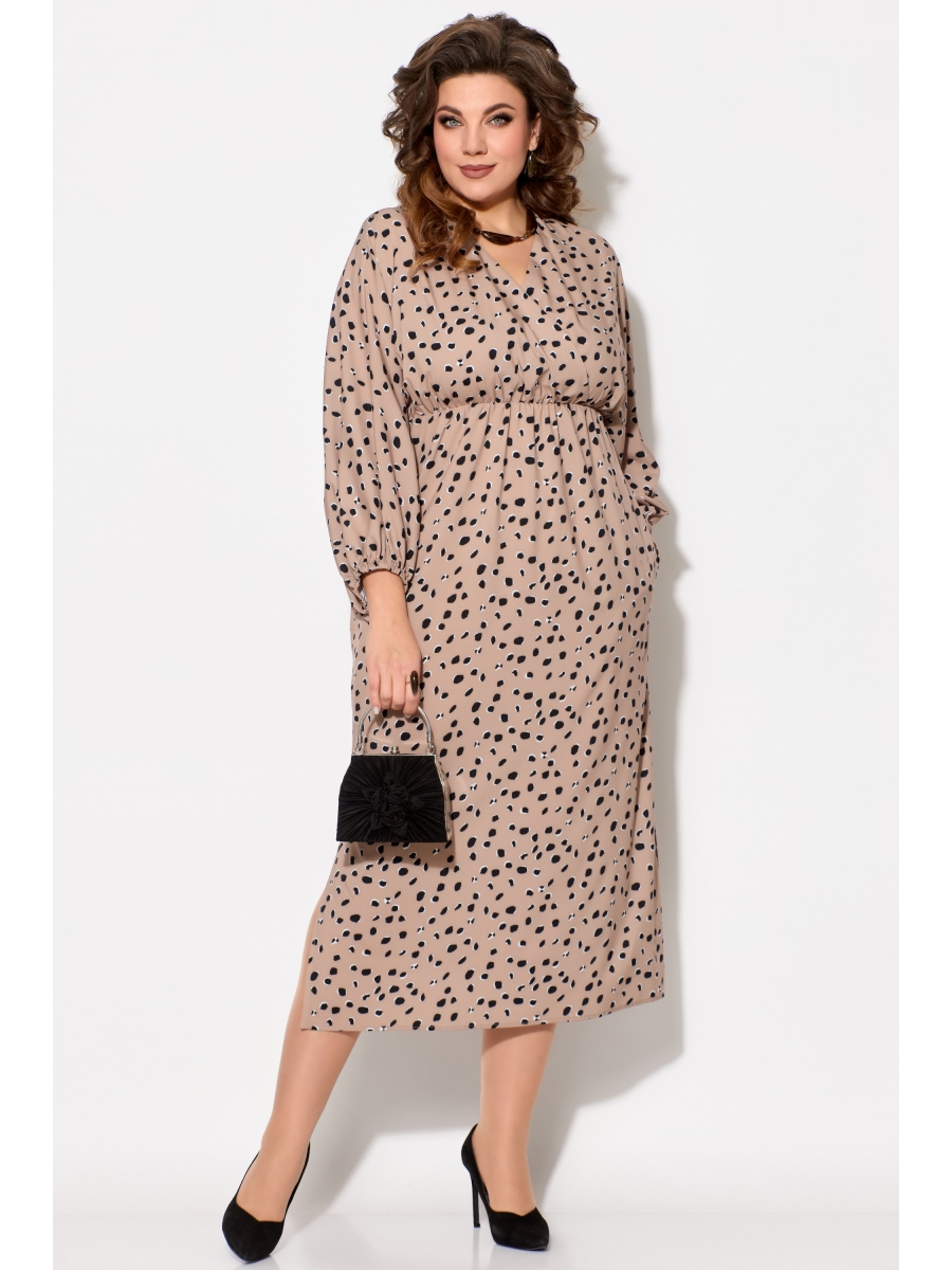 Элегантное женское платье ЛЮТИЦА, длина "миди". Прямого силуэта. Горловина V-образной формы, на "запах". Выше линии талии обработан подрез. Верхняя часть платья собрана на резинку. Рукав цельнокроеный, длинный, расширенный к низу. Низ рукава собран на резинку. В боковых швах обработаны разрезы.