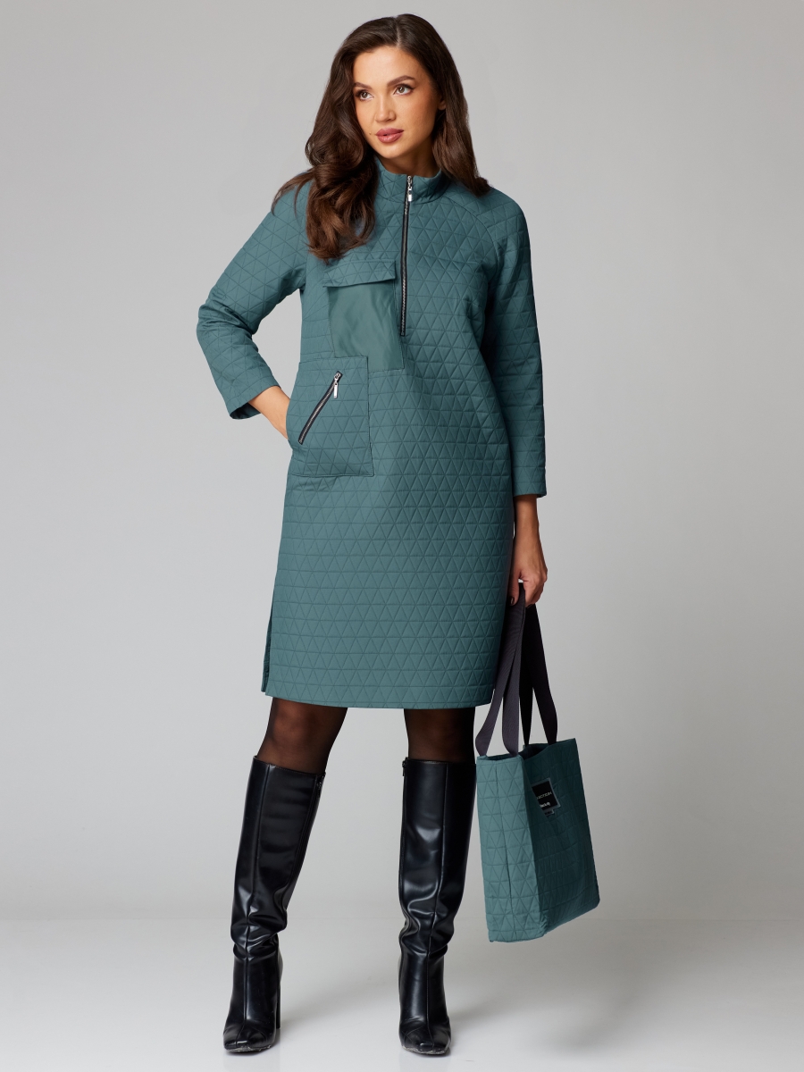 Оформить заказ →Платье женское, прямого силуэта. Рукав реглан с вытачкой по плечу, длина 7/8. Горловина с воротником стойкой на застежку – молнию. По переду, с правой стороны два накладных кармана, верхний карман из отделочной ткани с клапаном из основной ткани, нижний карман из основной ткани с одним входом на тесьму-молнию и другим с боковой стороны. В боковых швах платья разрезы. Спинка со средним швом.