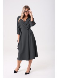 Элегантное женское платье из костюмной ткани необычного кроя станет изюминкой вашего гардероба. Платье полуприлегающего силуэта, отрезное по линии талии со спущенным плечом. Рукав 3/4 длинный на отрезной манжете. По полочке идут защипы-складки в верхней и нижней частях, запах - на петли и пуговицы по подрезу. По нижней части платья запах идет в виде складки. По спинке кокетка со складкой, по подрезу вставлена резинка. Юбка-полусолнце с односторонними складками по полочке, по бокам карманы. По горловине воротник на отрезной стойке. Платье будет идеально смотреться с туфлями, ботинками и сапогами.