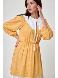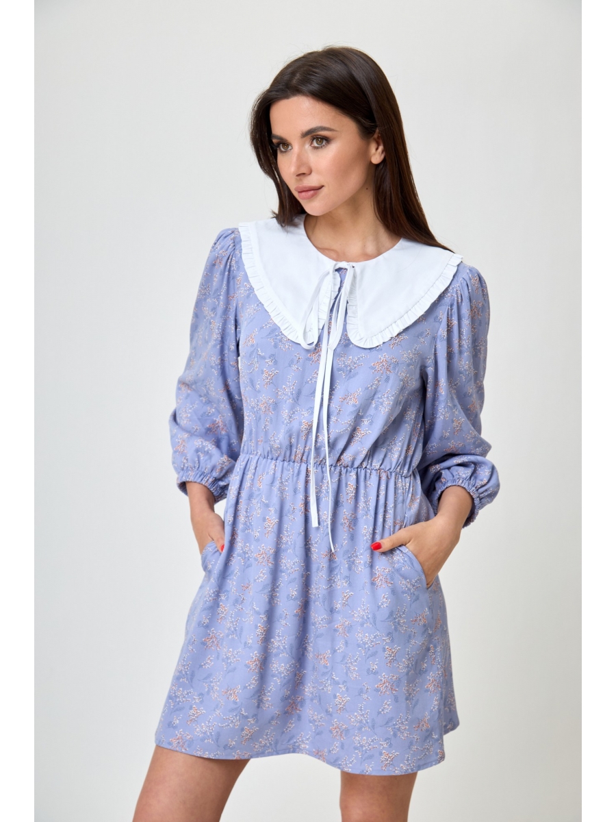 Платье женское свободного кроя, округлая горловина, длина до колена. Рукав 3/4, со сборкой по окату и низ на резинке. По линии талии резинка. На спинке глазок, на петле пуговице. Платье благодаря цвету и принту дышит женственность и лёгкостью, актуально и стильно. Благодаря съемному воротнику и подъюбнику можно создавать нежнейший образ. Купив его вы ни разу не пожалеете о своём выборе.