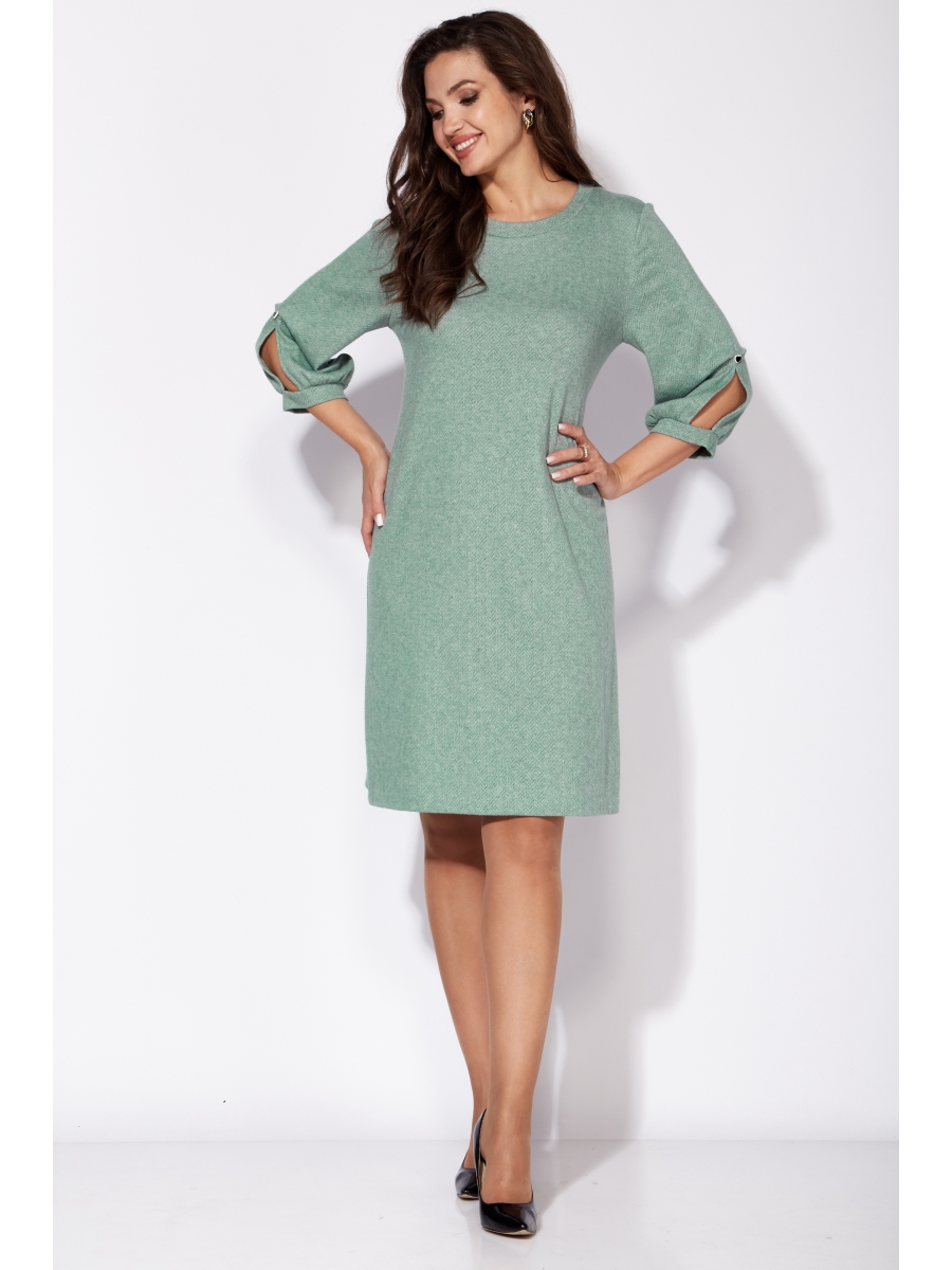 Платье женское, А образного силуэта с рукавом длиной 3/4 . Рукав фантазийной формы, к низу расширен и присобран на притачную манжету. По центру рукава шов, к низу переходящий в разрез. По шву мягкая складка, акцентированная пуговицей. Вырез горловины круглой формы с подрезной бейкой. Перед платья задекорирован оригинальной вышивкой с паетками. Спинка без особенностей.