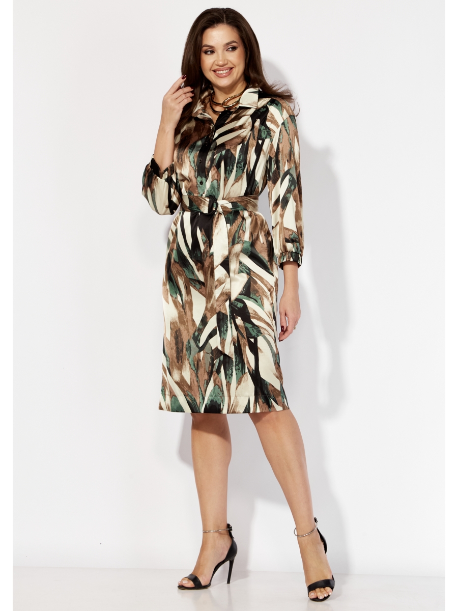 Платье женское, прямого силуэта с рукавом длинной 7/8. Рукав со спущенной линией плеча, по низу манжета с резинкой. Воротник рубашечный, на стойке. Застежка до линии талии, с отрезной планкой на петли и пуговицы. Из под кокеток переда и спинки-сборка. По боку платья, шлица. Линию талии подчеркивает съемный пояс с полукольцами.