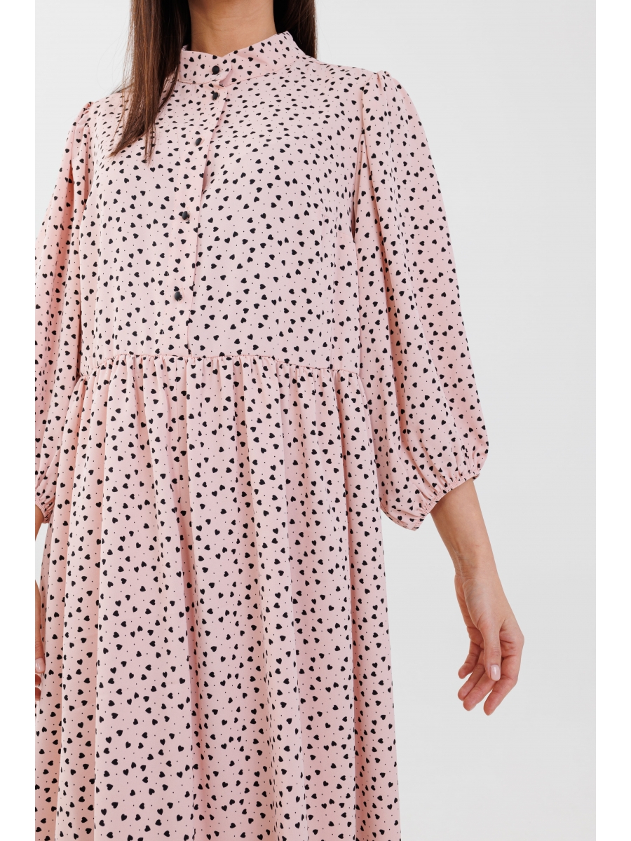 Платье женское, оверсайз силуэта, длина ниже колена по переду, спинка длиннее. Рукав втачной со сборкой по окату, низ на резинке, длина 3/4. Горловина обработана стойкой. По переду нагрудные вытачки и планка на петли пуговицы до линии талии. Платье отрезное по линии талии, юбка на сборке. Платье актуально, как для ежедневной носки, так и для романтических вечеров.