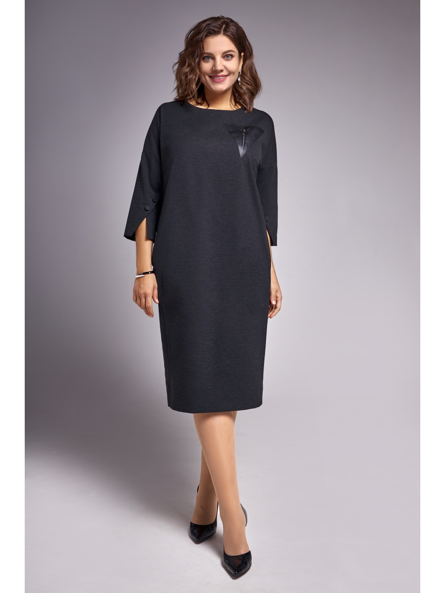 Платье из трикотажной ткани полуприлегающего силуэта, вырез горловины круглый, застежка по спинке на молнию, в боковых швах карманы. По переду декоративная деталь из кожи с молнией.