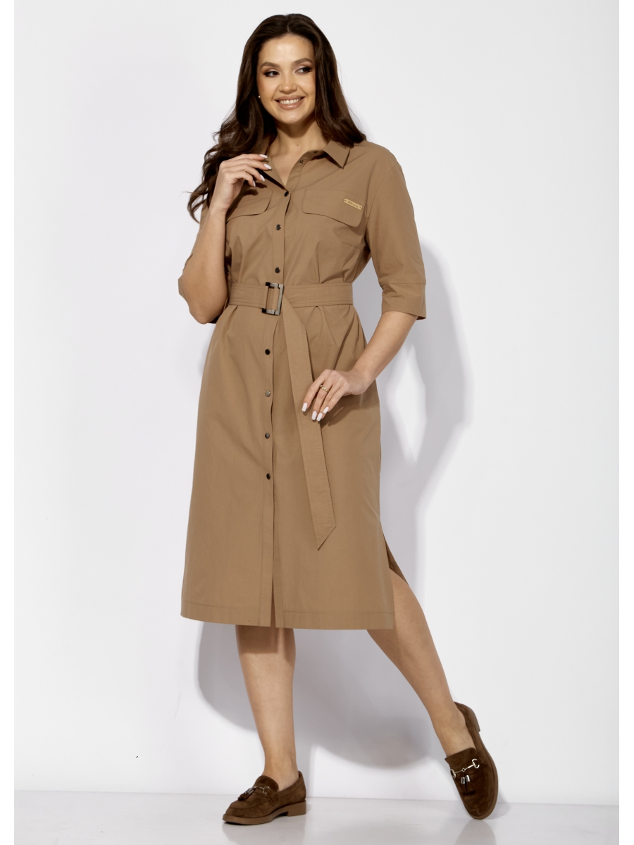 Оформить заказ →Платье женское, прямого силуэта, с рукавом длиной 3/4. Рукав с чуть спущенной линией плеча и манжетой по низу. По переду нагрудные вытачки и отделочные клапаны с декоративной нашивкой. Воротник рубашечный на стойке. Застежка по центру, с отрезной планкой на кнопки. Карманы в боковых швах. Спинка без особенностей. Талию подчеркивает съемный пояс.