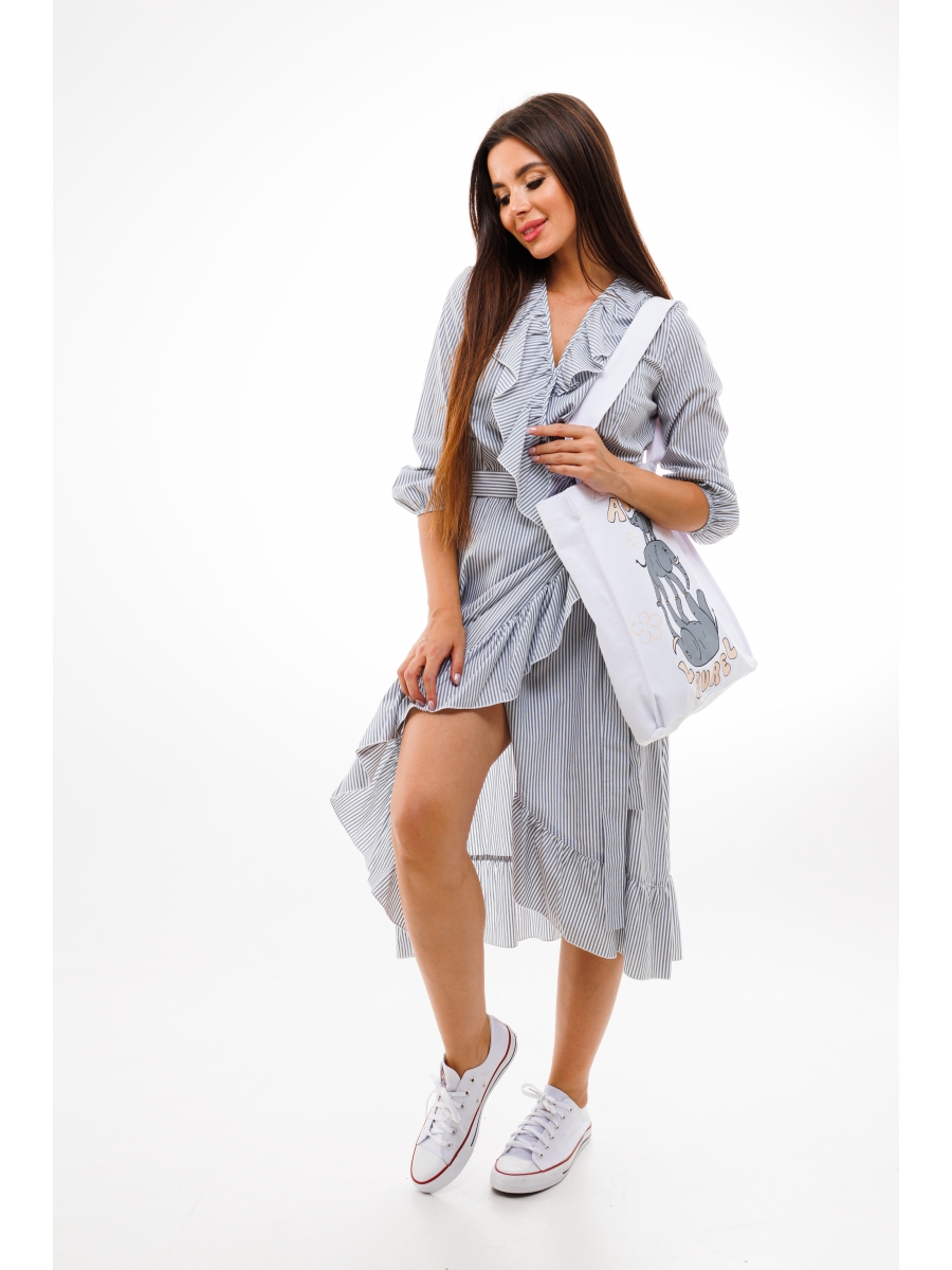 Оно украшено изысканными рюшами и имеет ассиметричный крой, придающий ему особую изящность.