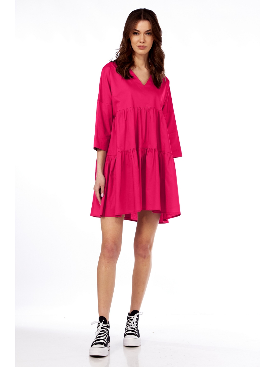 Платье женское, свободного силуэта, выполнено из хлопкового полотна. Горловина V-образной формы. Передняя и задняя часть с двумя отрезами и мелкой сборкой по всему изделию. Плечо спущенное.