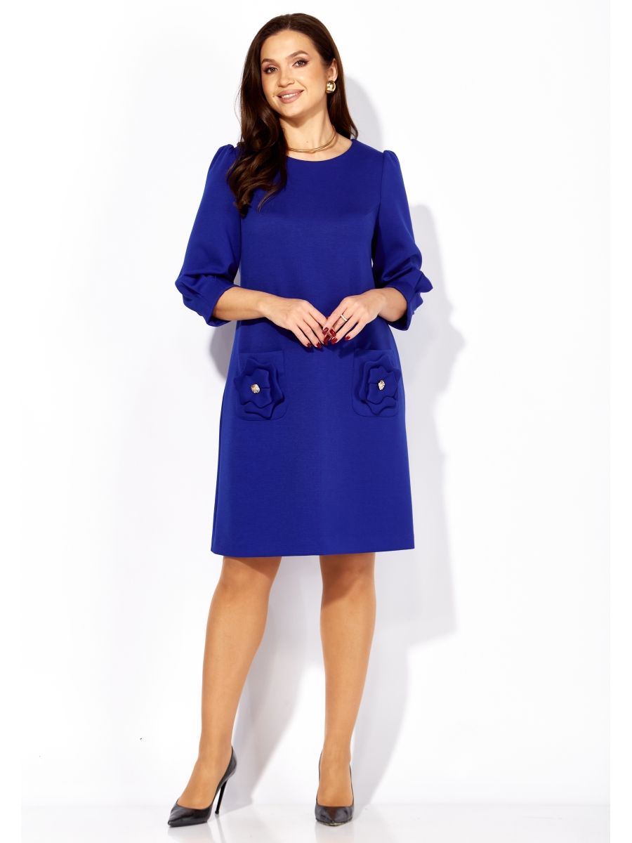 Платье женское, А силуэта, с рукавом длинной 3/4. Рукав втачной, со сборкой по окату, и мягкими складками по низу. По переду нагрудные вытачки. Вырез горловины круглой формы. Карманы накладные, акцентированы стилизированным цветком с декором. По спинке средний шов с отделочной нашивкой сверху.