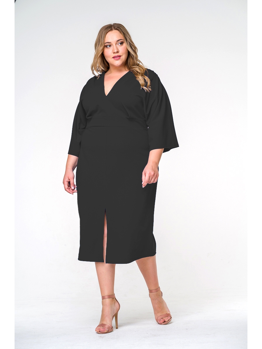 Платье с V - образным вырезом из эластичного крепа полуприлегающего силуэта. Под линией груди подрез. Рукав цельнокроеный, свободный. Нижняя часть переда с центральный швом и разрезом.