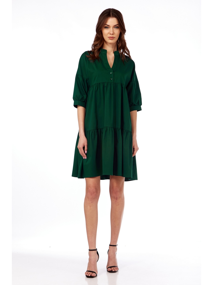 Оформить заказ →Платье женское, свободного силуэта, с застежкой на две пуговицы в верхней части переда. Передняя и задняя часть платья с двумя отрезами и мелкой сборкой по всему изделию, в боковых швах карманы. В верхней части переда отделочная планка. Горловина со стойкой. Плечо спущенное, рукав с мелкой сборкой в верхней и нижней части с приталенной манжетой.