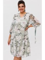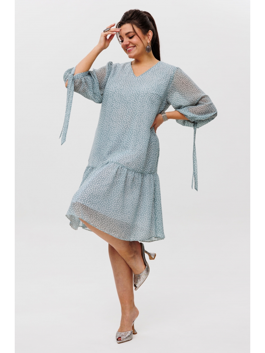 V-образный вырез горловины добавляет элегантности, а волан по низу платья придаёт романтичную нотку образу. Рукава украшены завязками, что делает образ ещё более утончённым.