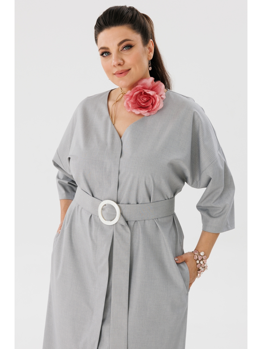 Платье прямого силуэта со спущенными рукавами. V-образный вырез горловины, застежка потойная на пуговицы по всей длине платья. Дополняет образ съёмный пояс на пряжке. Выполнено из ткани плательно-костюмной группы оттенка луны.