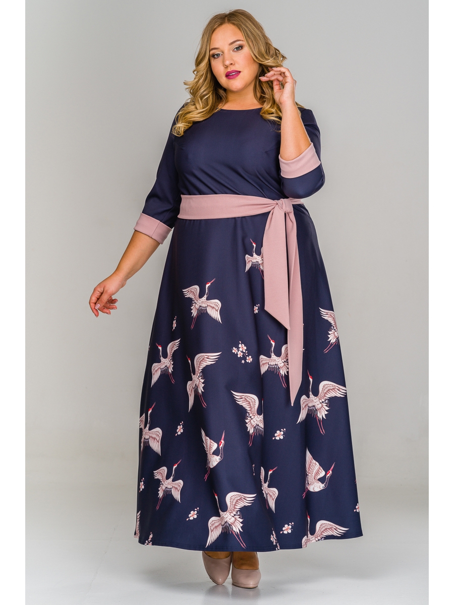 Романтичное длинное платье из крепа с эластаном. Принт - журавли. Отрезное по линии талии, юбка расклешенная, манжеты и пояс цвета сомон. Пояс в комплекте.