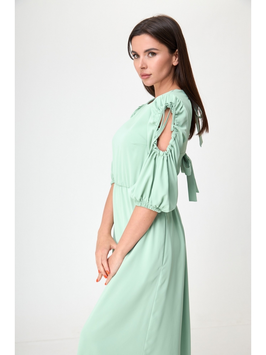 Спину украшает изысканный вырез с двумя воздушными бантами, которые словно бабочки готовы вспорхнуть при каждом вашем движении. Рукава-три четверти с нежными сборами и ажурными разрезами, подчеркнутыми тончайшими шнуровками, добавляют образу романтичную таинственность.
