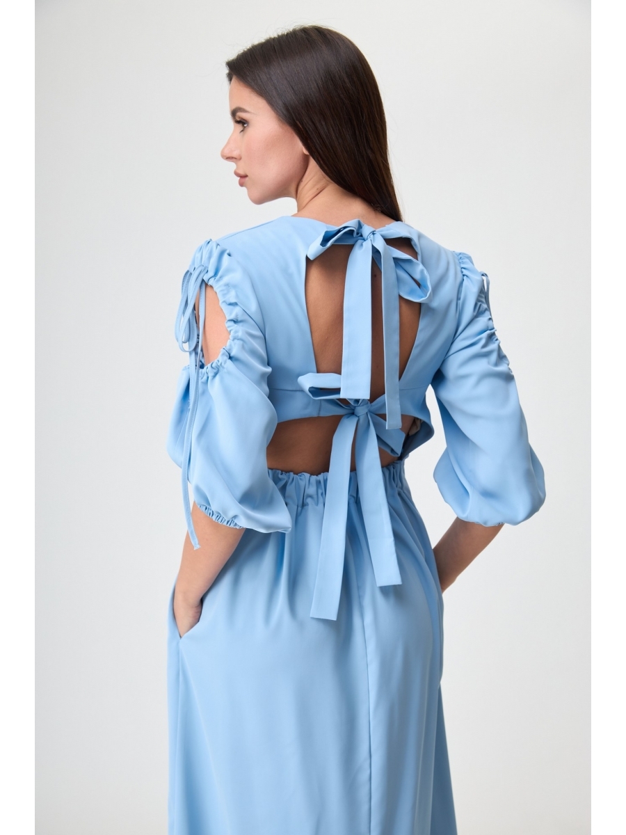 Спину украшает изысканный вырез с двумя воздушными бантами, которые словно бабочки готовы вспорхнуть при каждом вашем движении. Рукава-три четверти с нежными сборами и ажурными разрезами, подчеркнутыми тончайшими шнуровками, добавляют образу романтичную таинственность.