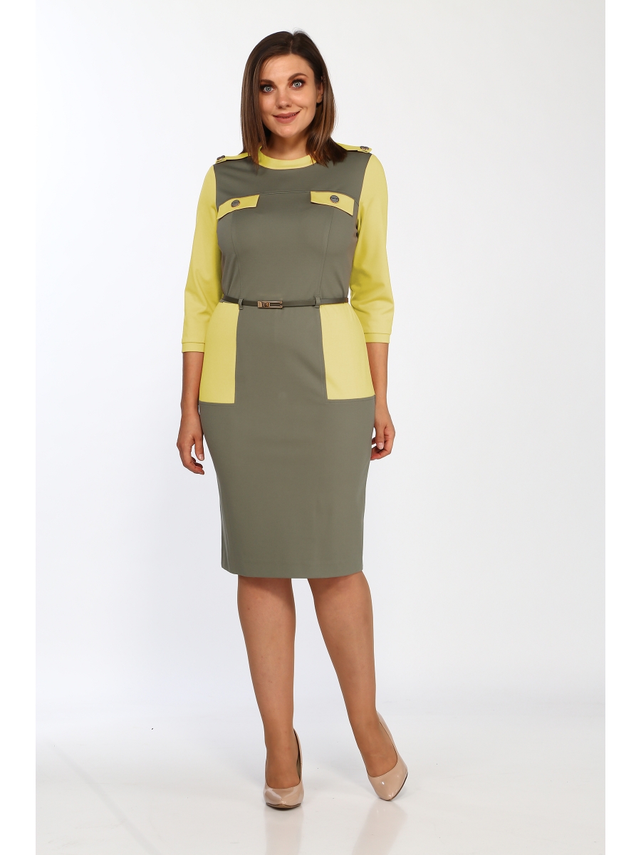 Платье прилегающего силуэта с круглым вырезом горловины, обработанной отрезной отделочной деталью.Перед отрезной по линии талии. Лиф с кокеткой и рельефами, проходящими через центр груди.В шов притачивания кокетки вставлены клапаны. Юбка переда с бочком из отделочной ткани. Спинка отрезная по линии талии. Лиф спинки со средним швом и талиевыми вытачками.Юбка спинки с бочком из отделочной ткани, центральная часть со средним швом. В среднем шве спинки обработана застежка потайной тесьмой-"молнией" и шлица. Рукава втачные одношовные, низ обработан притачной манжетой. На плечевых швах расположены погоны. По линии талии настрочены шлёвки. Платье комплектуется поясом.