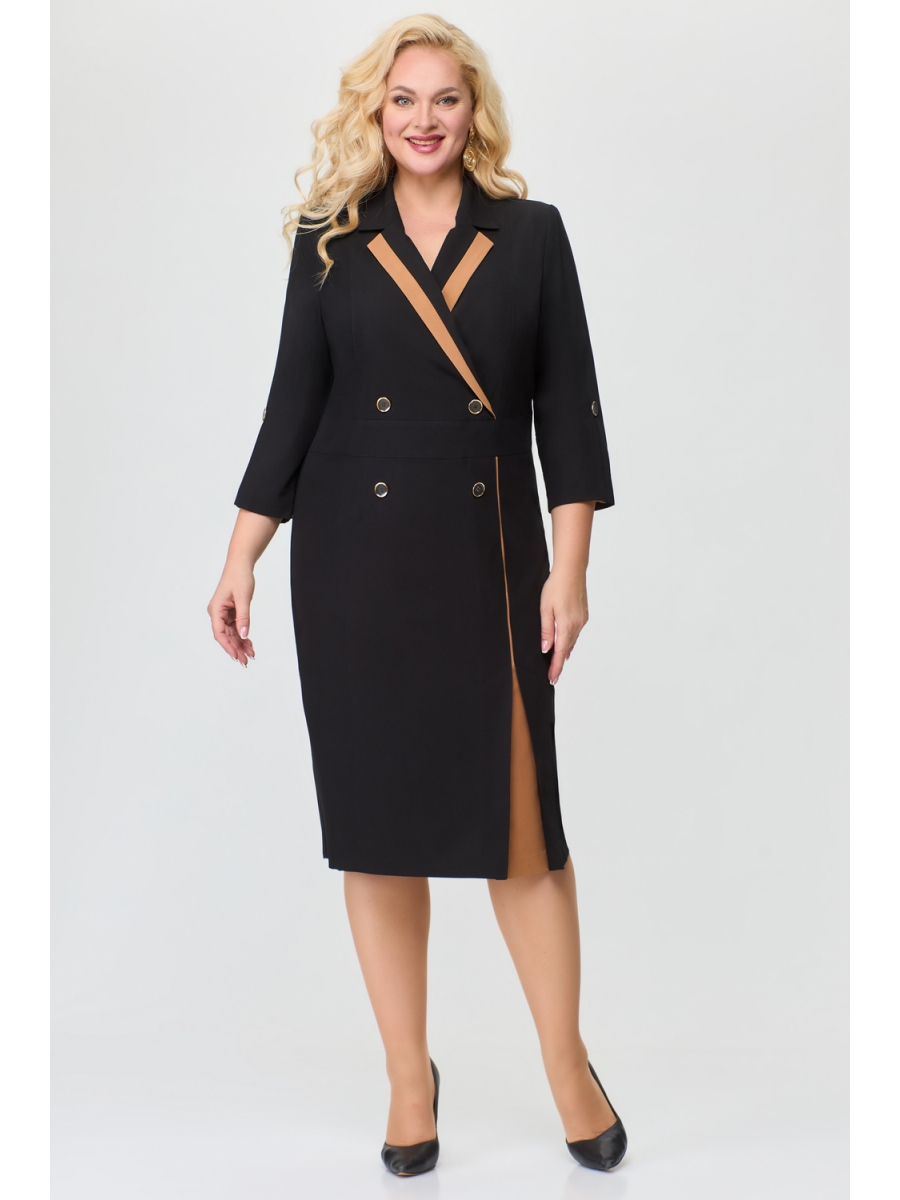 Платье женское полуприлегающего силуэта, с имитацией двубортной застежки, с пиджачным воротником. Перед отрезной по линии талии. Верхняя часть с рельефами от плечевого шва, нижняя часть с талиевыми вытачками, встречной складкой. Спинка со средним швом, по низу шлица. Рукав втачной, длиной ¾, из двух частей по низу встречная складка.